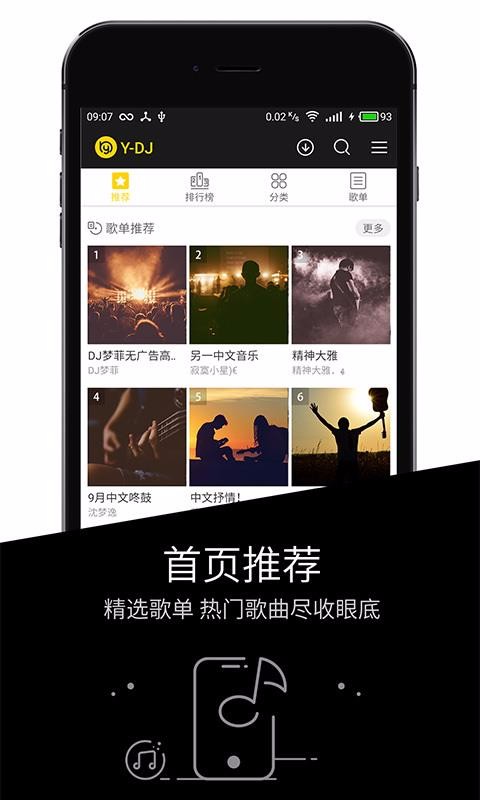 4、在首页精选各种歌单为您推送,热门DJ音乐尽收眼底,随手播放;