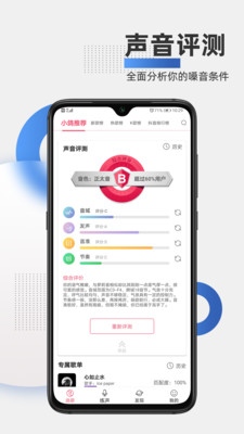 通过专业的声音检测算法了解您的声音特质,根据声音特质为你挑选适合你演唱的歌曲。