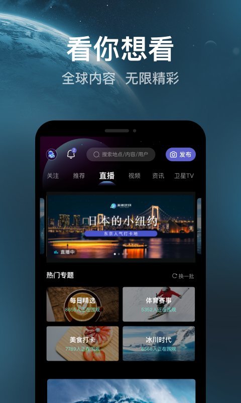 直播地球app最新版是一款手机直播应用软件,不同于大众直播,我们将为你实时播放卫星眼中的地球,各种卫星图片任你观看,了解全球发生的热点新闻和地理情况,快来下载吧!