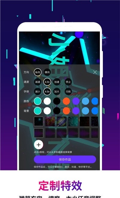 你可以随意切换弹幕的方向,滚动速度,字体大小和颜色,还有多种字体效果、动感背景可以选择。