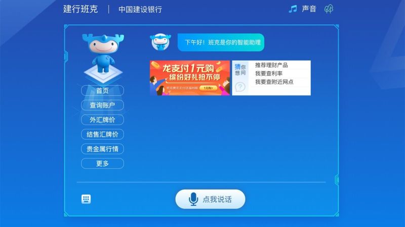 智能班克app,中国建设银行旗下智慧银行服务平台。用户通过软件即可实现与班克之间的语音对话服务,提供账户查询、外汇牌价、结售汇牌价以及贵金属行情等查询功能,专属服务,智在班克。