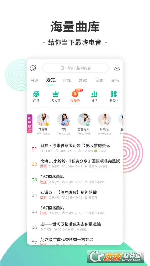 y2002电音app是一款电音类音乐软件,这里有车载、喊麦、广场舞歌曲等类别近千万首电音歌曲,支持在线试听、全免费、一键下载听、极省流量不花钱、还有更多现金等你抢。喜欢的朋友快来西西下载吧!