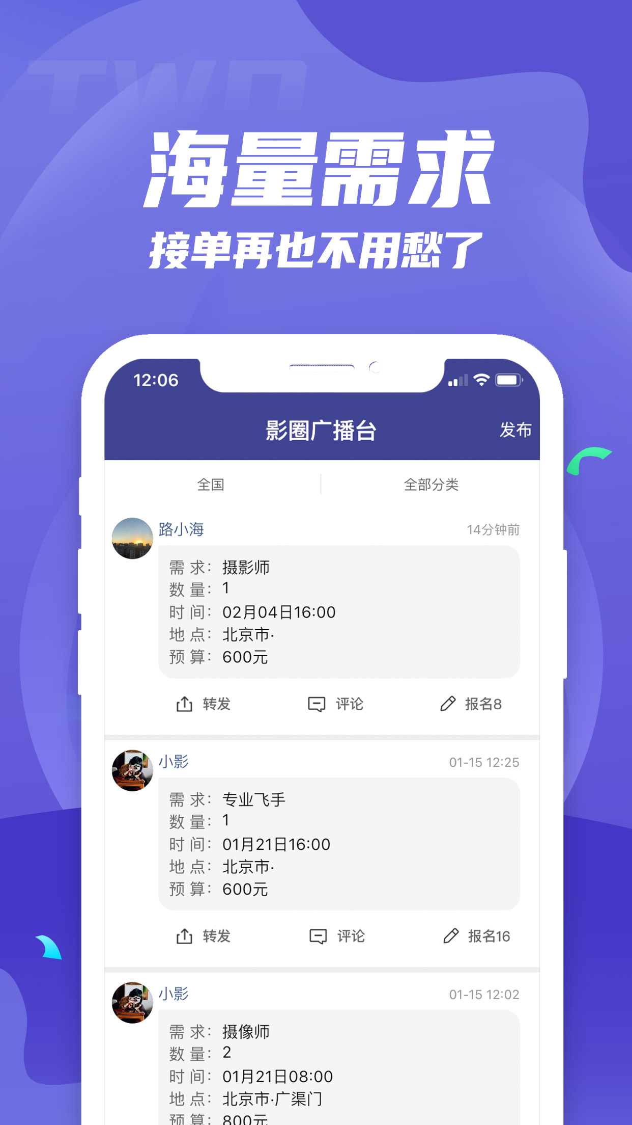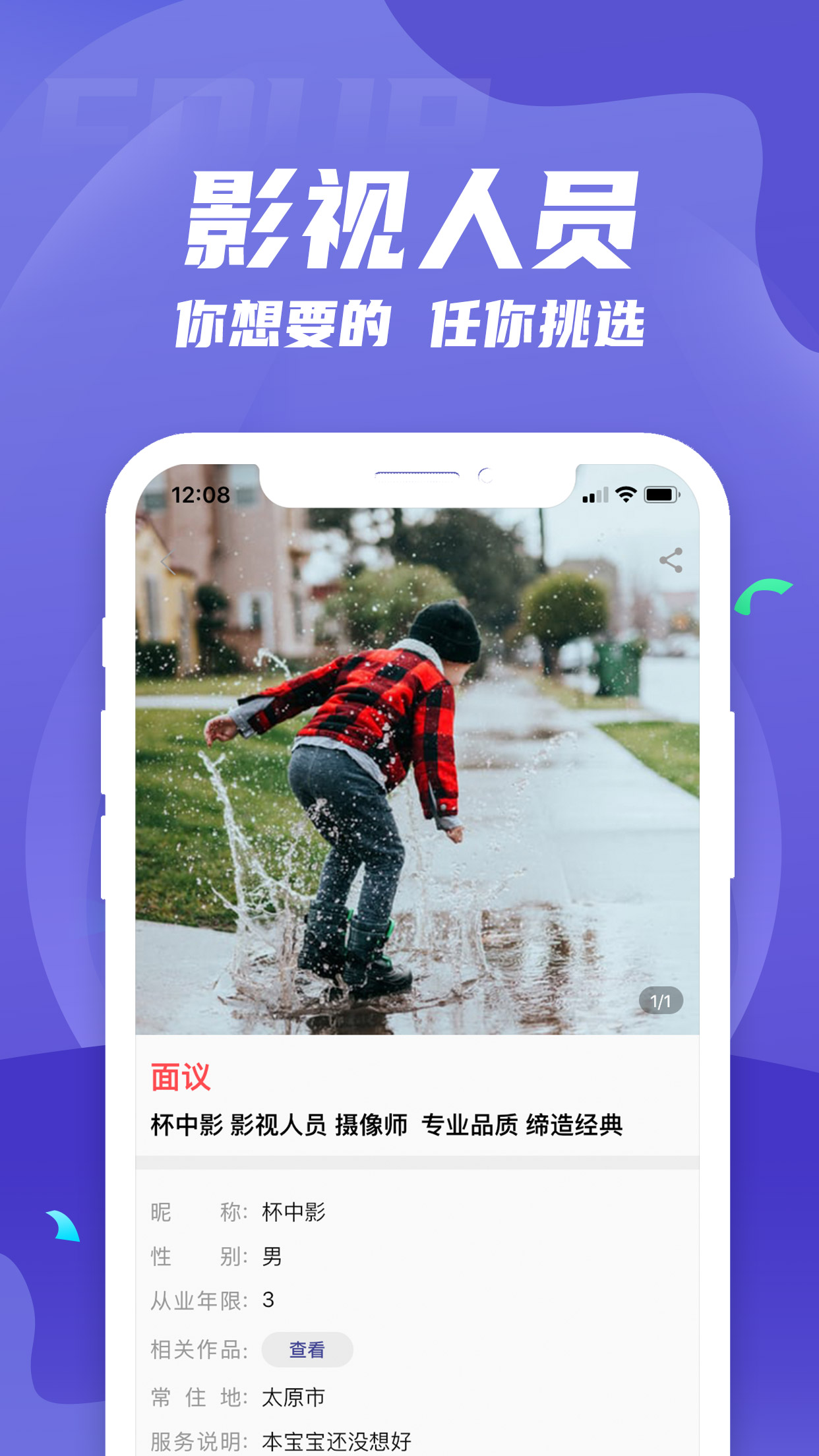影圈app,影视人必备的社交圈子,共享优质影视资源,提供器材、场地租赁服务,汇聚大量摄影人员,轻松对接,快速交流,轻松找到需要的影视资源。