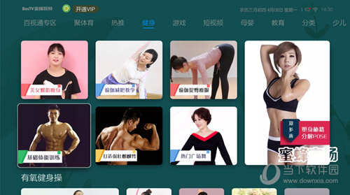 蜜蜂视频健身Tab首页,打开蜜蜂视频向右滑动焦点,就能到达健身页面,里面的内容涵盖了健身舞、健身操、舞蹈教学、广场舞、瑜伽教学等等健身内容。
