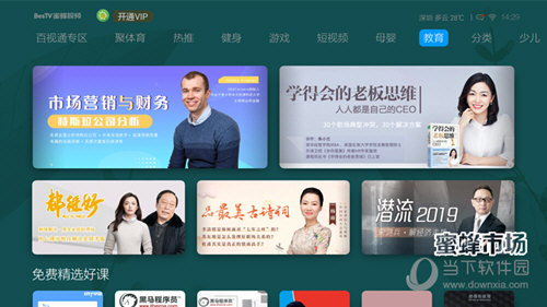 蜜蜂视频教育Tab首页,打开蜜蜂视频向右滑动焦点,就能找到教育页面的,里面有小学教育,职业教育,中学教育等课程内容,大部分是根据实际的课程编排的。