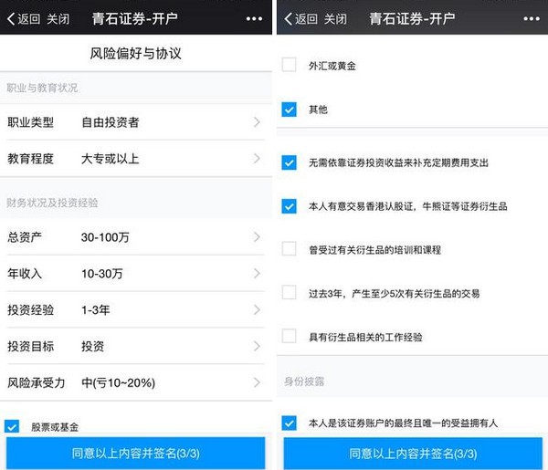 填写风险偏好与协议及身份披露信息,填写完毕进入签名页