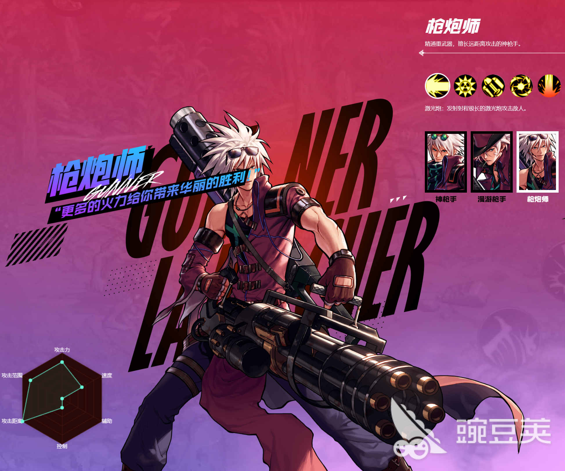漫游枪手:他的移动速度快,在地上来回摩擦,可以轻松躲避对手的攻击,同时还可以在移动中射击,打出稳定的输出。核心技能回旋踢,可以在空中释放,造成大量的浮空伤害,同时还可以改变自己的方向,打出意想不到的角度。虽然技能十分炫酷,且连招多样,但是伤害比较刮痧容错率低。