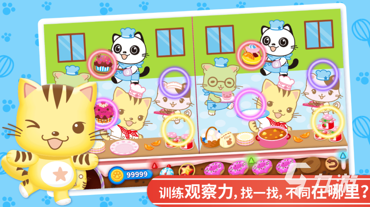 星猫找不同是款为小宝宝定做的找茬类游戏,游戏中所有的图片上都刻有可爱的卡通角色,这样精美无比的卡通图片十分吸引小孩子,小朋友可以通过这些图片了解到新鲜的食物,本作也能让孩子们的思维能力和观察力得到提升。这款找不同游戏收录了五百多个关卡,充满童趣的BGM也让孩子们沉醉其中,通过关卡也会给孩子带来一定的成就感。