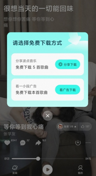波点音乐下载音乐的方法和简单,还是和平时的音乐软件操作方法一样,不过如果想要免费下载音乐需要分享或看广告。简单来说,波点音乐支持免费下载音乐,不过虽然免费下载,却需要你通过分享或看广告的形式才能下载,且下载时没有音乐品质选择,此外波点音乐还支持蝰蛇音效功能。