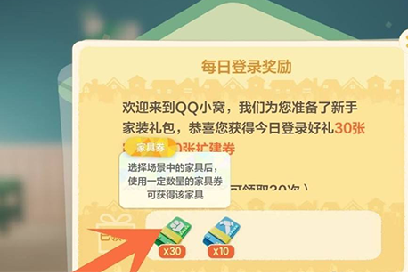 首次登录QQ小窝的小伙伴还能领取新手家装礼包,其中就能领取家具券。