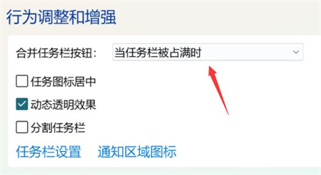 3、然后将合并任务栏按钮修改为“从不”或者“当任务栏被占满时”就可以自动不折叠了。