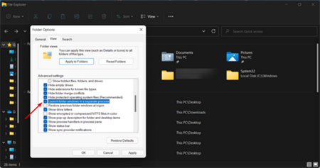 3、向下滚动选项并在单独的进程中选中与 Launch 文件夹选项关联的框