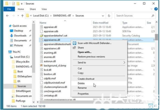 在安装windows11系统的过程中,如果提示电脑配置不满足,我们只需要删除一个文件就可以绕过所有硬件的限制。首先下载好win11系统镜像后,在电脑上打开文件资源管理器,然后定位到C:$WINDOWS.~BTSources文件夹,在这里找到appraiserres.dll文件并把其删除,接下来返回到安装界面,点击后退按钮,再点下一步就可以正常升级Windwos11系统了。