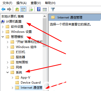 2、在“本地组策略编辑器”中,定位到以下位置:“计算机配置”——“管理模板”——“系统”——“Internet 通信管理”中