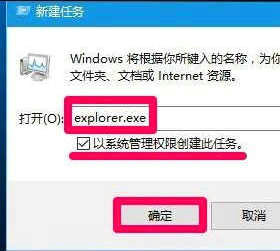 6、打开新建任务对话框输入explorer.exe,选中以系统管理权限创建此任务打勾,点击确定即可解决