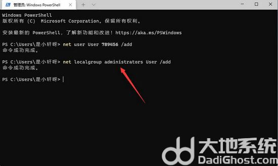 4、创建完成后,再输入“net localgroup administrators User /add”回车赋予管理员权限。