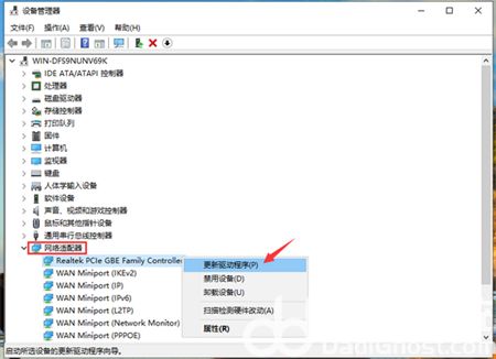 2、在设备管理器中,展开网络适配器,右键当前的网卡选择“更新驱动程序”。