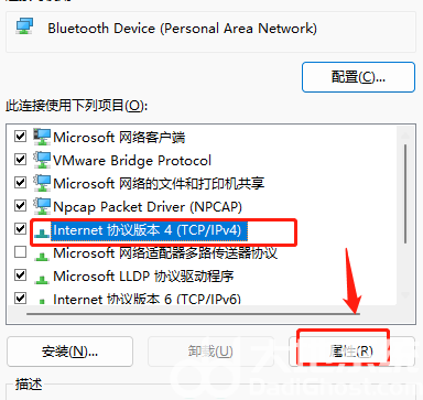 找到对应的接口,鼠标右键点击属性,选中internet 协议版本 4(TCP/IPV4),点击属性
