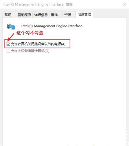 在属性对话框中,切换选项卡到【电源管理】项上,取消勾选【允许计算机关闭此设备以节约电源】后系统在休眠后就可以正确的唤醒了。