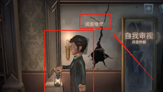 1、进入游戏以后,操纵人物来到”调查墙壁“这里。