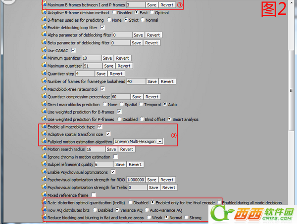 ②项Enable all macroblock type:动态块划分方法,在Level较低时允许使用包括8x8、4x8、4x4划分方法。 建议选择(注意:如果要使用这些划分方法,需要Subpel refinement quality俗称子像素优化设置大于等于5!)以提高画质。