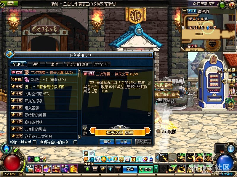 男枪二觉跟其他职业一样在赛丽亚处接到任务后去黑龙大会刷45个黑龙之息就ok了,黑龙大会基本都是绝望之塔的apc不过难度要低不少可以轻松过,最大的好处是刷这个图不耗疲劳。