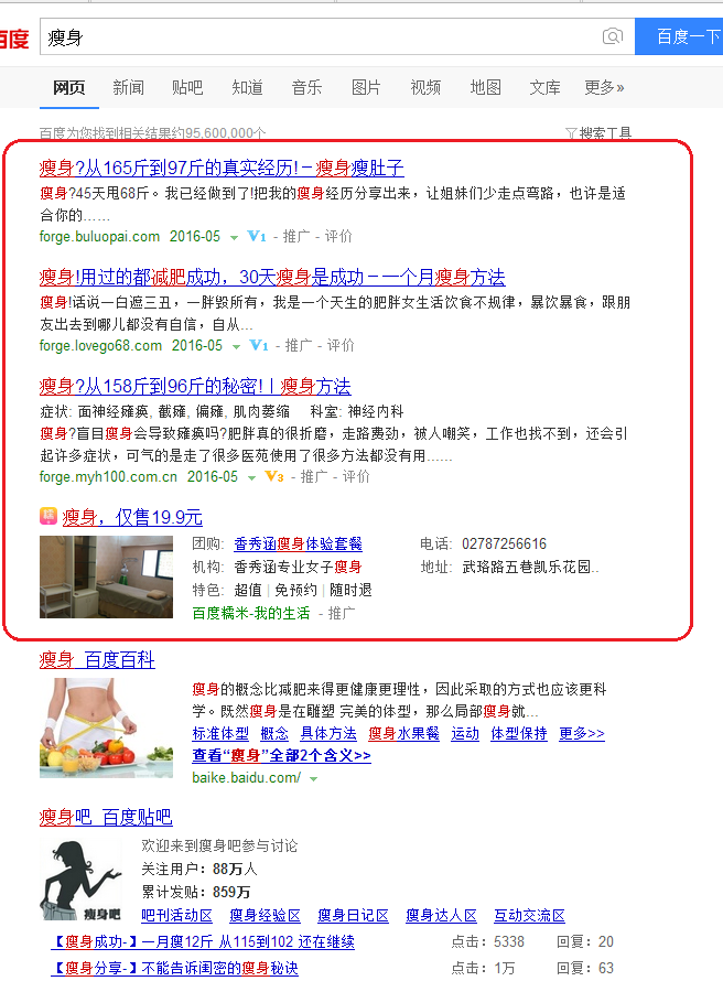 可以很明确的发现推广广告占的比重在整个页面变小了,整个推广被缩在了暗粉色的小方框内,还表明推广链接,这样对于上网的群众来说有了简单的辨识度。