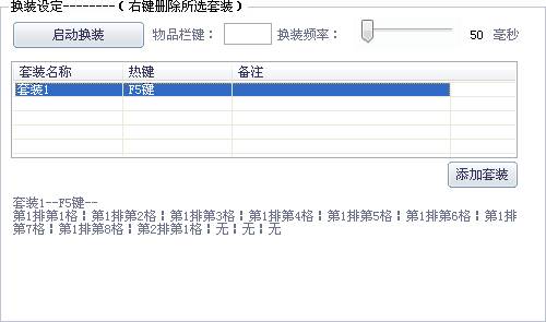 一键时装的设置方法和一键换装的设置方法一样。也是对相应的格子添加套装,添加好后,启动一键时装。只要按了热键,游戏内就会自动模拟鼠标操作,去打开装扮窗口(如果你装扮窗口有设置快捷键,这里的装扮窗口键要和游戏里保持一致),然后去换那几个格子,换完后再关闭装扮窗口。当然同样由于是模拟鼠标动作,所以有时会出现漏装的情况,请根据个人电脑自我调整频率,减少漏装出现的机率。