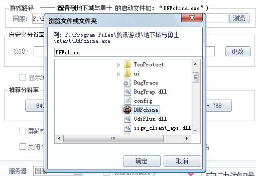 选中游戏目录“start”里的“DNFchina”,点确定。路径就会自动保存。 以后点“启动游戏”就会直接打开游戏主程序了。