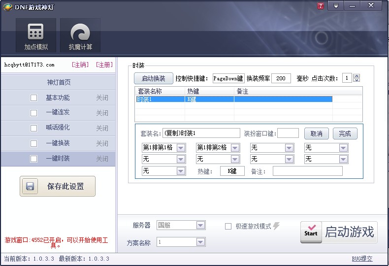 此物品栏键对应的是玩家在游戏里设置的打开物品栏的快捷键,需自己手动设定,一定要保持和游戏里的一样,不然有可能会出错。 换装原理是这样:在640*480模式下,按下“L”后,软件会自动在游戏里检测物品栏有没有开,开的话就直接按着第一格,第二格……进行模拟鼠标点击换装,换装后关闭物品栏。 若物品栏没有打开, 同时物品栏键为空,这时就会自动点击,去打开物品栏,然后进行换装,换装后,关闭物品栏。若物品栏没有打开,但物品栏键已经设置好了,这时软件就会自动按物品栏键,然后换装,换装完关闭物品栏。 换装我们也增加了控制快捷键,同时,你可以手动设定换装频率,不是很急的话就设成100,基本上机器一次可以搞定。 如果很急的话并且在图里(在图里装备更换会有一个CD),用换装频率10。然后点击3次。基本也可以实现全部换装。 另外还有一套智能换装,智能换装目前不是非常快,但是比较稳定。有一个注意就是,你换装的格子中,不能有空的格子,就是你设定的每个格子里面必须是你要换的装备,如果会空,程序会一直卡在空的格子上,这时需要手动关闭神灯,重开神灯才能解除。