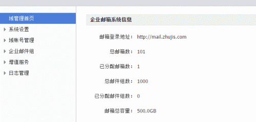2、如果是企业邮箱管理员登录的话,默认的首先会进入到企业邮箱管理设置页面, 主要包括系统设置、域账号管理、企业邮件组、日志管理等。(点击放大)