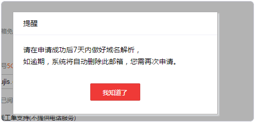 4、这时万网会提示你去设置好域名DNS解析,否则会被删除已经申请的免费企业邮箱。
