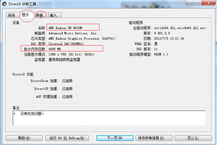 2、 在这个出现的DirectX诊断工具里面,大家可以查看到操作系统、处理器、内存、显卡等信息。