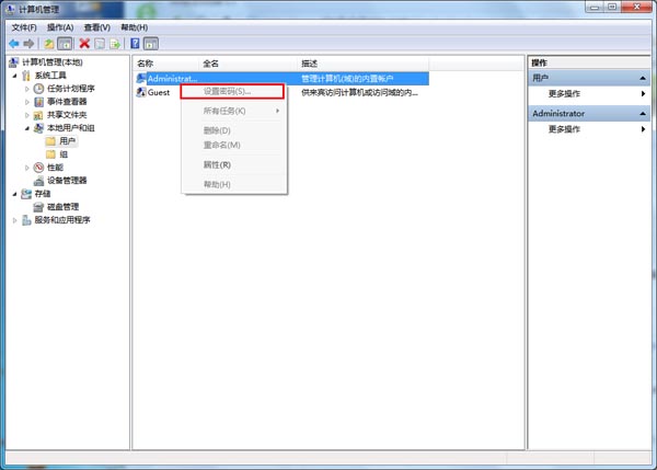 2、桌面计算机右键弹出菜单选择“管理”;在计算机管理页面左侧可以看到“本地用户和组”双击它,接着打开“用户”;在中间的界面名称“Administrator”右键弹出菜单点击“设置密码”回车键或者继续。在设置密码提示框输入"000"确定,电脑在开机就不会有开机密码了。