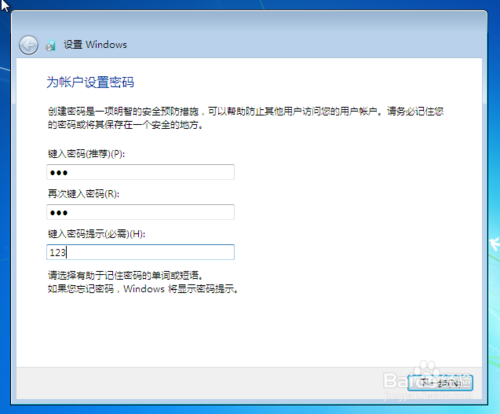 出现下面这图的时候建议直接点下一步,不要去设置密码,这个密码不是开机密码,不一样的。要是以后忘了会很麻烦。所以不建议设置。