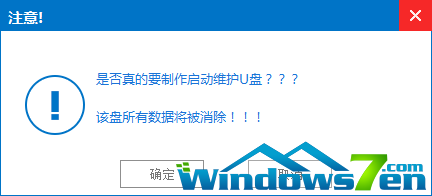 3、接着是会弹出一个提示界面,大家这时选择“确定”就可以了。对于此过程是会格式化U盘,大家在确定前最好把数据都转移了。
