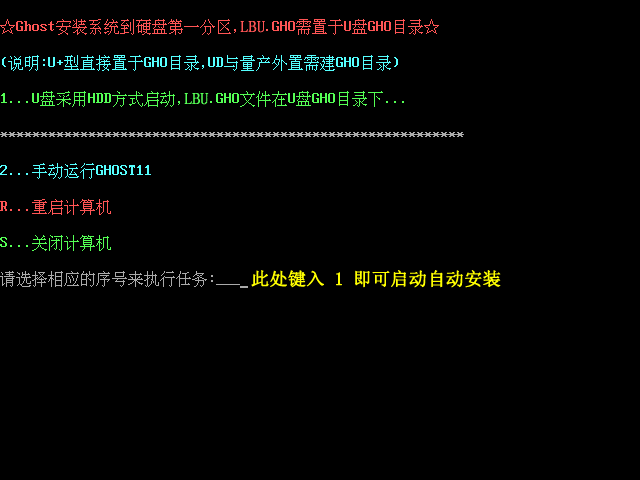 插入U盘启动后点击“不进PE安装系统GHO到硬盘第一分区”即可进入安装系统状态了: