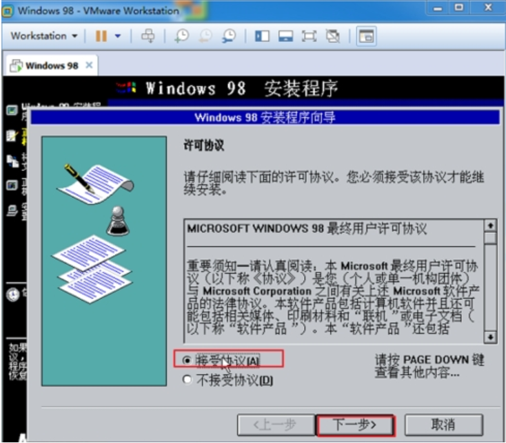 11.选择 ;我接受协议(A); --> 点击 ;下一步>。