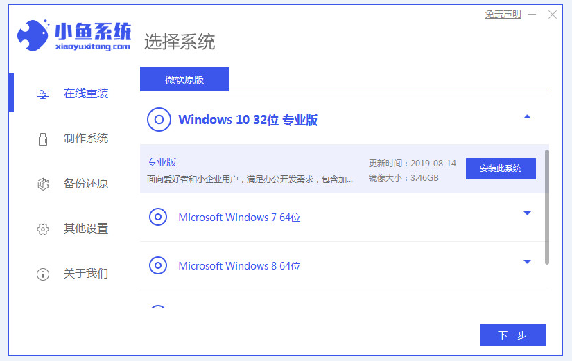 1、在官网上下载并打开小鱼一键重装系统工具,选择自己需要安装的系统,选择完后点击安装此系统,点击下一步。