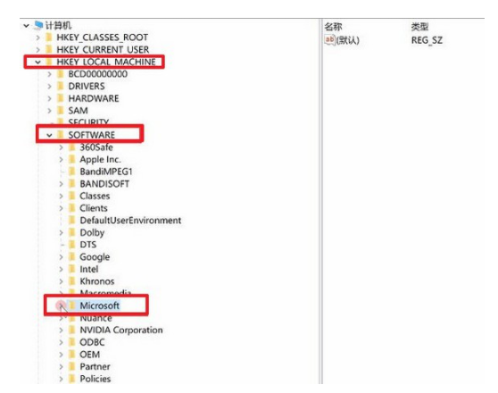 3、 打开注册表编辑器,依次打开HKEY_LOCAL_MACHINE/SOFTWARE/Microsoft。