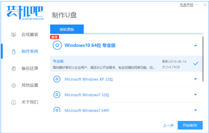 1、首先下载安装装机吧一键重装系统软件并打开,插入一个 8GB 以上 U 盘,点击开始制作即可。