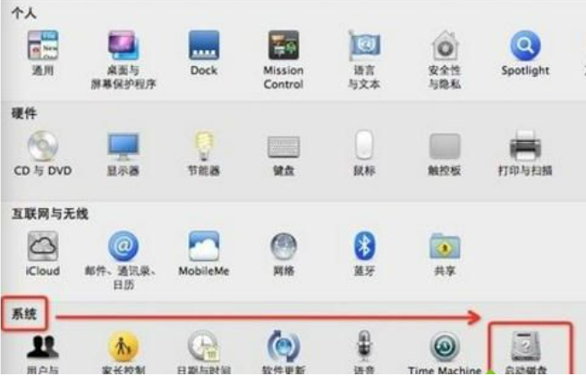 (2)进入“系统偏好设置”界面,选择“系统”栏目->“启动磁盘”。在弹出的启动磁盘对话框里选择“windows磁盘”,再点击下面的“重新启动”按钮。再进入系统的时候就是windows系统。还可以点击桌面最上面的“苹果”图标,进入“系统偏好设置”,再进入启动磁盘启动windows系统。