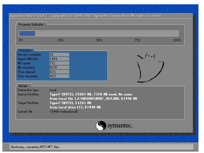 5、我们在重装系统过程中,就不需要我们在进行更多的操作,这时我们所见到的画面是一键还原精灵所提取的文件释放到所选好的磁盘分区的过程,如图下图所示: