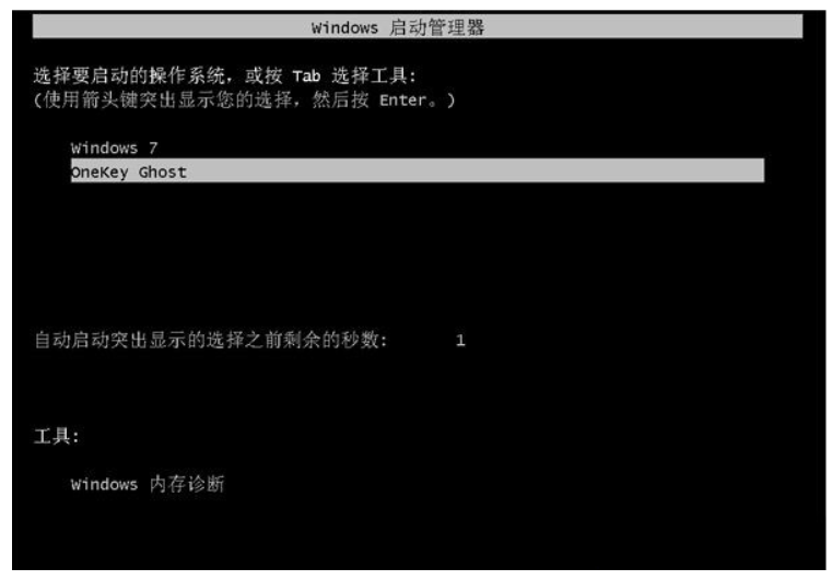 5.这时电脑重启,开机启动项多出Onekey Ghost,默认选择这个选项进入。