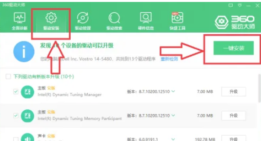 3.安装驱动:点击工具栏的”驱动安装“,勾选待更新或安装的驱动,点击”一键安装“。