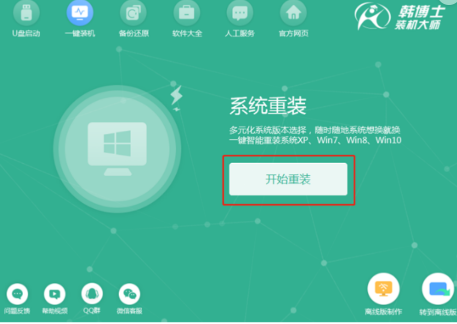 1.下载安装韩博士一键重装系统软件,点击“开始重装”随后开展系统环境监测.