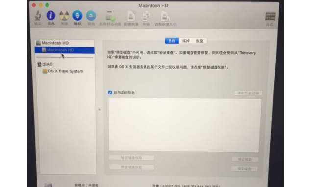 点一下【磁盘工具】;点击第二个磁盘(Macintosh HD ),如下图鼠标的位置所示;【注意】如果您安装了Windows双系统,那么下图会出现第三个磁盘(BOOTCAMP盘)这个不用抹掉,没有的话(下图中就没有)和不懂我在说什么的同志看下一步,没事;