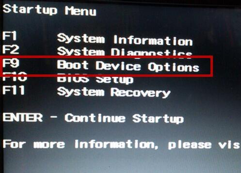 1、首先我们需要制作U盘启动盘,找一台可以上网的电脑制作完成后按下电脑开机键,然后不停的敲击“F12”键(电脑型号不同按键不同),进入startup menue,选择“F9 Boot Device Option”回车(不同型号的电脑不一样,你只需要选择含有Boot Device Option的即可)。