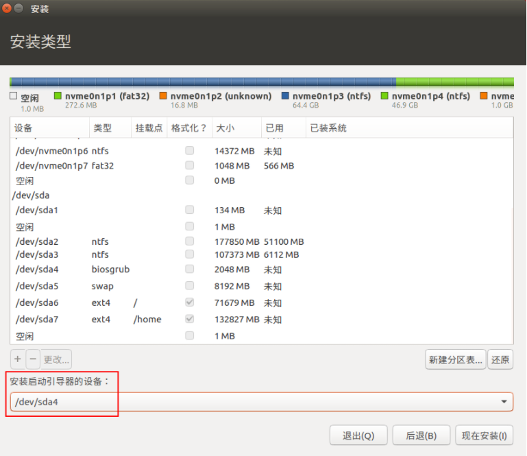 10、选择引导器。分配好上述四个空间后,我们还要选择“安装启动引导器的设备”,由于刚才biosgrub的磁盘符号为/dev/sda4,所以就选择了该磁盘。