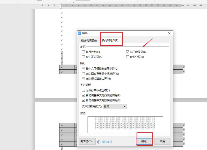 3、接着在打开的菜单中选择换行和分页选项,在分页项目栏中勾选与下段同页选项,再点击确定按钮。